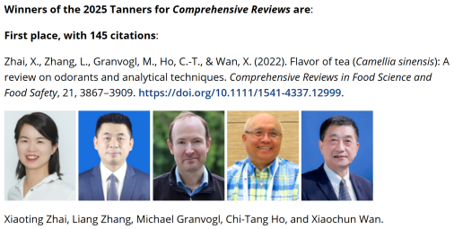 本网讯 近日,由美国食品科技学会(Institute of Food Technologists,IFT)主办的期刊Comprehensive Reviews in Food Science and Food Safety发布了2025年度高被引论文奖,我校茶树种质创新与资源利用全国重点实验室翟小婷副教授为第一作者,宛晓春教授为通讯作者于2022年发表的题为“Flavor of tea (Camellia sinensis): A review on odorants and analytical techniques”的文章,被评为该期刊Comprehensive Reviews板块的高被引论文,并授予Tanner Award奖。