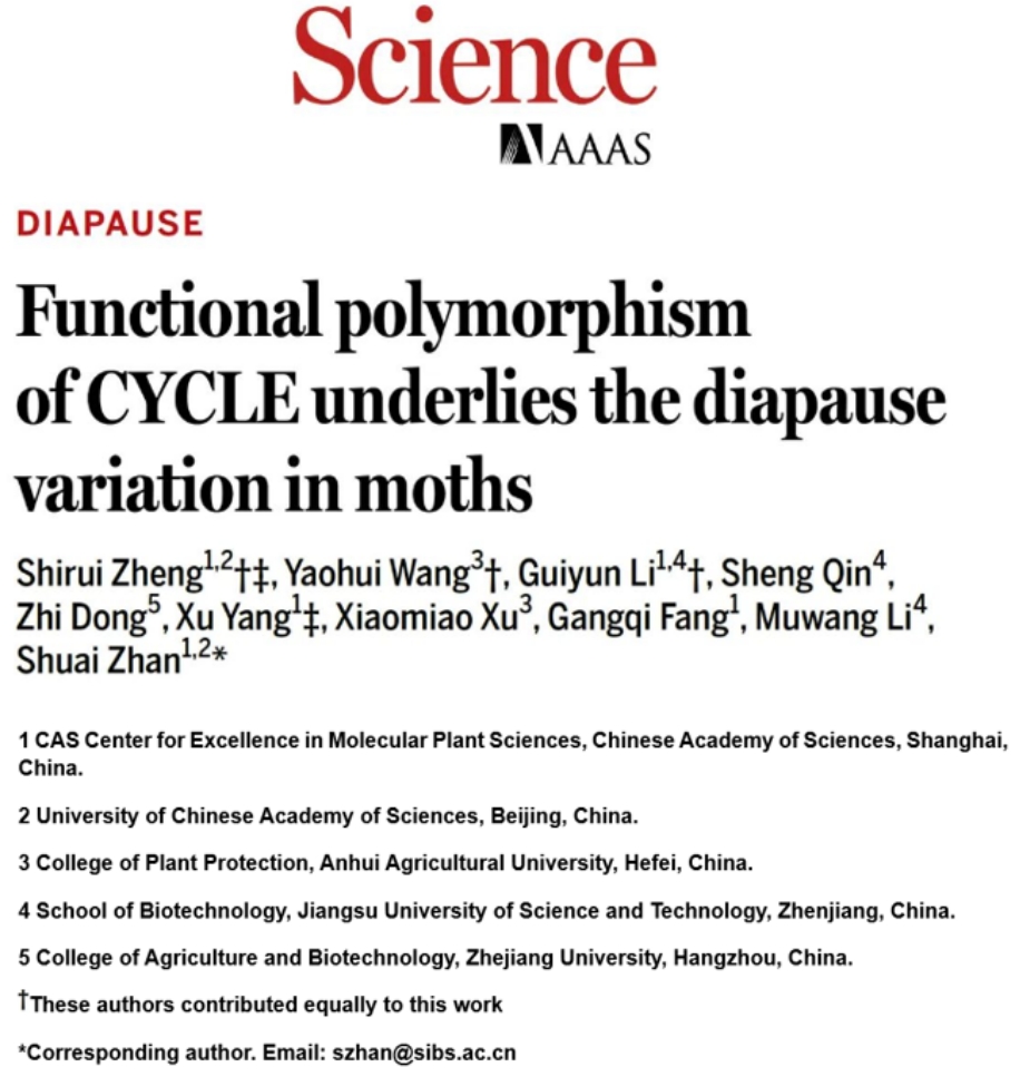 本网讯 5月30日,我校植物保护学院王耀辉教授联合中国科学院分子植物科学卓越创新中心詹帅研究员,在《科学》(Science)杂志上发表了题为Functional polymorphism of CYCLE underlies diapause variation in moths的研究论文。该研究首次发现核心生物钟基因Cycle是调控家蚕等鳞翅目昆虫滞育变异的关键基因,并揭示了鳞翅目昆虫生活史变异的遗传基础。本研究所揭示的分子机制,为基于遗传学手段打破滞育、高效利用经济昆虫和资源昆虫等提供了理论依据。研究成果更对于掌握害虫的种群发生规律、保障国家粮食安全、促进生态系统稳定性等方面具有重要意义。