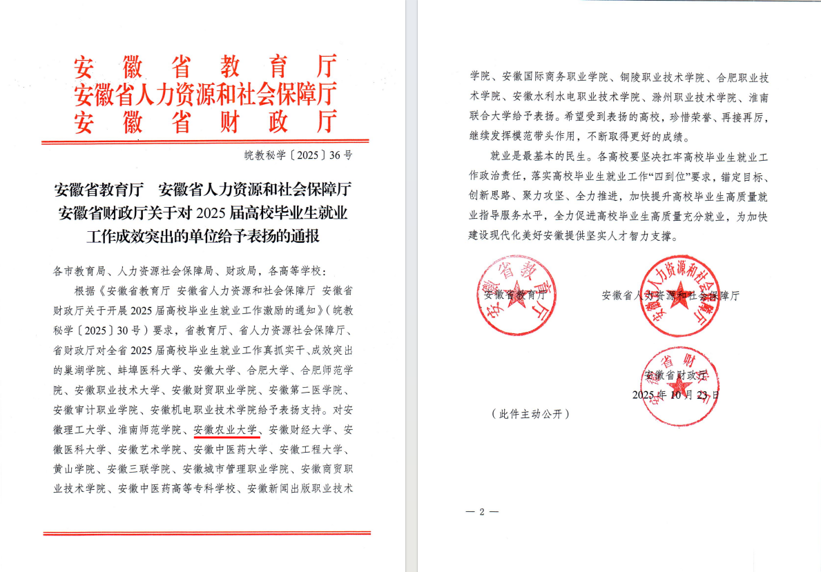 本网讯 近日,安徽省教育厅、安徽省人力资源和社会保障厅和安徽省财政厅联合下发了《关于对2025届高校毕业生就业工作成效突出的单位给予表扬的通报》,我校获得通报表扬,这也是我校连续三年获得就业工作成效突出单位表扬。