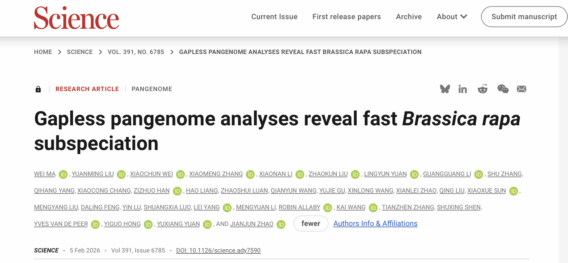 本网讯 2月6日,《Science》刊发我校园艺学院十字花科蔬菜团队与河北农业大学赵建军教授团队及国内外多家科研机构共同完成题为“Gapless pangenome analyses reveal fast Brassica rapa subspeciation”的研究成果。该研究为达尔文提出的“被子植物为何能在地球上迅速崛起、并在极短地质时间内完成爆发式多样化”这一悬而未决的“恼人之谜”提供了新的基因组学视角:以一棵看似普通的白菜(Brassica rapa)为切入口,系统描绘了“白菜王国”如何从一个共同祖先演变为“诸侯并立”的多亚种格局,构建了一个将经典进化问题落地到具体作物系统的基因组学研究范例。