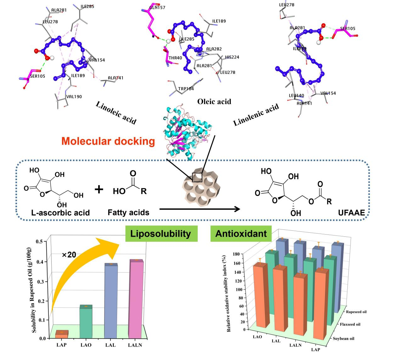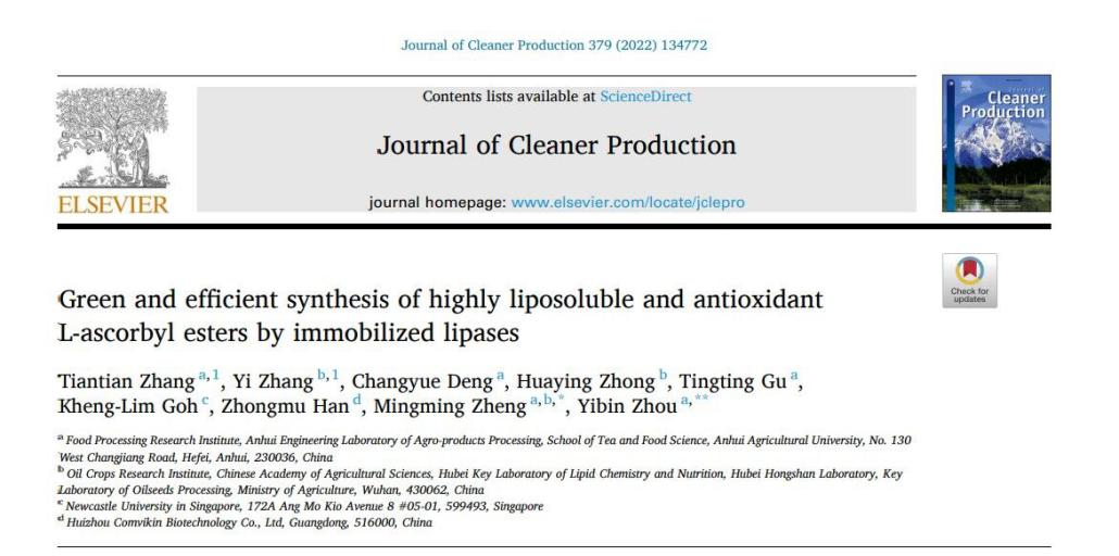 近日,以我校为第一单位,中国农科院油料所为第二单位,在郑明明教授和周裔彬教授共同指导下,2020级茶与食品科技学院硕士研究生张甜甜在国际顶级学术期刊清洁生产《Journal of Cleaner Production》(中科院一区,IF=11.072)发表了最新研究成果“Green and efficient synthesis of highly liposoluble and antioxidant L-ascorbyl esters by immobilized lipases”。该研究针对高活性酶催化剂被国外企业垄断的问题,提出了一种清洁、高效的固定化酶催化制备油脂抗氧化剂L-抗坏血酸不饱和脂肪酸酯的新方法,创建了高活性的有序介孔脂肪酶微阵列CALB@OMS-C8,其催化活性可以达到20.8 M g-1 h-1,较游离酶提高了8倍,创造了L抗坏血酸酯的最高催化活性纪录。同时,创制出L-抗坏血酸油酸酯、L-抗坏血酸亚油酸酯和L-抗坏血酸亚麻酸酯3种新型油脂抗氧化剂,并阐明了脂肪酶与油酸、亚油酸、亚麻酸的分子对接规律,计算出脂肪酶CALB和脂肪酸的结合能顺序为:亚麻酸(-18.8 kJ/mol)>亚油酸(-15.4 kJ/mol)>油酸(-9.2 kJ/mol),进一步从理论上揭示了脂肪酸结构对酯化难易程度的影响规律。通过使用油酸、亚油酸、亚麻酸等不饱和脂肪酸替代棕榈酸作为酰基供体,较商品化的L-AP,熔点降低50oC以上,脂溶性提高7~20倍,抗氧化能力相当,可以显著拓展应用范围和场景。本论文为功能性脂质的酶法制备提供了新方法,为油脂和食品抗氧化提供了溶解性好,效率高的新型抗氧化剂,具有较强的产业化应用前景。