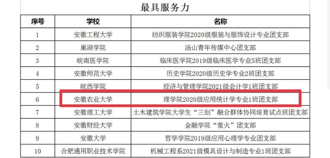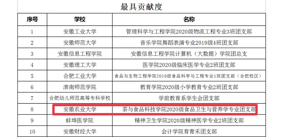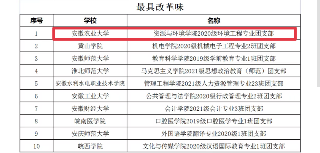 我校2020级环境工程专业团支部、2020级食品卫生与营养学专业团支部、2020级应用统计学专业1班团支部分别入选安徽省高校“活力团支部”最具“改革味”“最具贡献度”“最具服务力” TOP10榜,创客俱乐部入选安徽省高校“活力社团”创新创业类TOP5榜。其中2020级环境工程专业团支部、创客俱乐部同时还入围全国高校“活力团支部”“活力社团”评选。