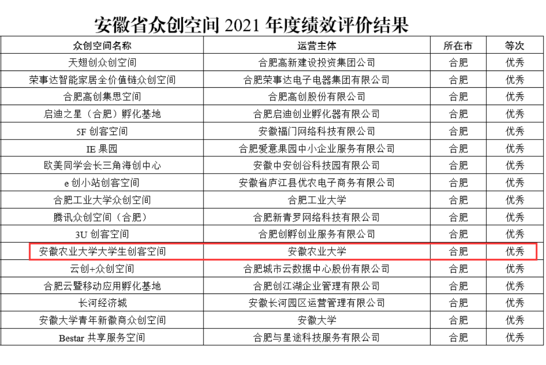 本网讯 近日,安徽省科学技术厅公布安徽省科技企业孵化器和众创空间2021年度绩效评价结果,对全省349家省级以上孵化载体绩效评价结果进行公示,我校大学生创客空间在绩效评价中获评优秀等级。