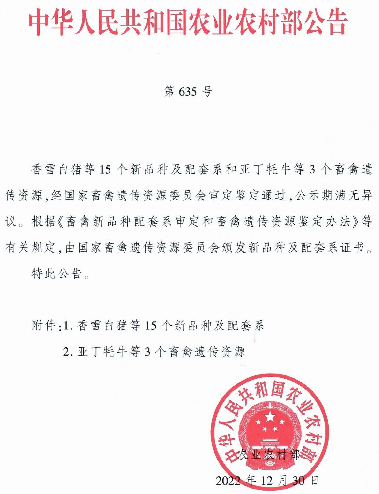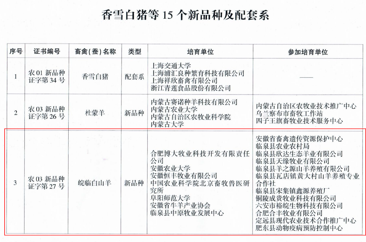 本网讯 近日,农业农村部发布635号公告,由合肥博大牧业科技开发有限责任公司、我校等单位联合培育得皖临白山羊新品种经国家畜禽遗传资源委员会审定鉴定通过,获颁新品种证书,成为我省第一个自主培育的具有完全知识产权的大家畜新品种,也是我国培育的一个肉用白山羊品种。