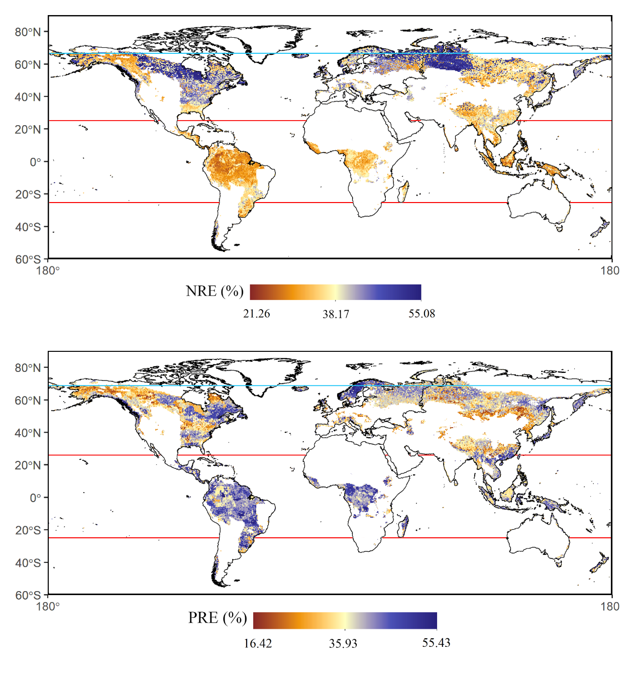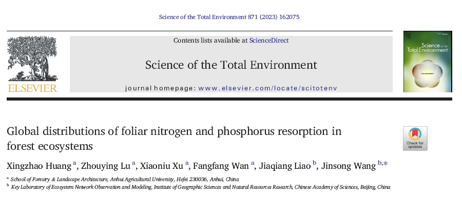 本网讯 近日,《总体环境科学》(IF=10.753,中科院一区)在线发表了我校林学与园林学院的最新研究成果《森林生态系统中叶片氮和磷再吸收的全球分布》(Global distributions of foliar nitrogen and phosphorus resorption in forest ecosystems)。该研究分析了影响叶片氮养分回流率(NRE)和磷养分回流率(PRE)的生物和非生物因素,预测了全球森林NRE和PRE的空间分布特征。研究结果表明,NRE和PRE在气候带、植物功能群和叶片氮磷比之间有相反的趋势,全球NRE的范围为21%-55%(平均值为38%),PRE的范围为16%-55%(平均值为36%)。NRE和PRE的空间变化分别与N-限制和P-限制相耦合。