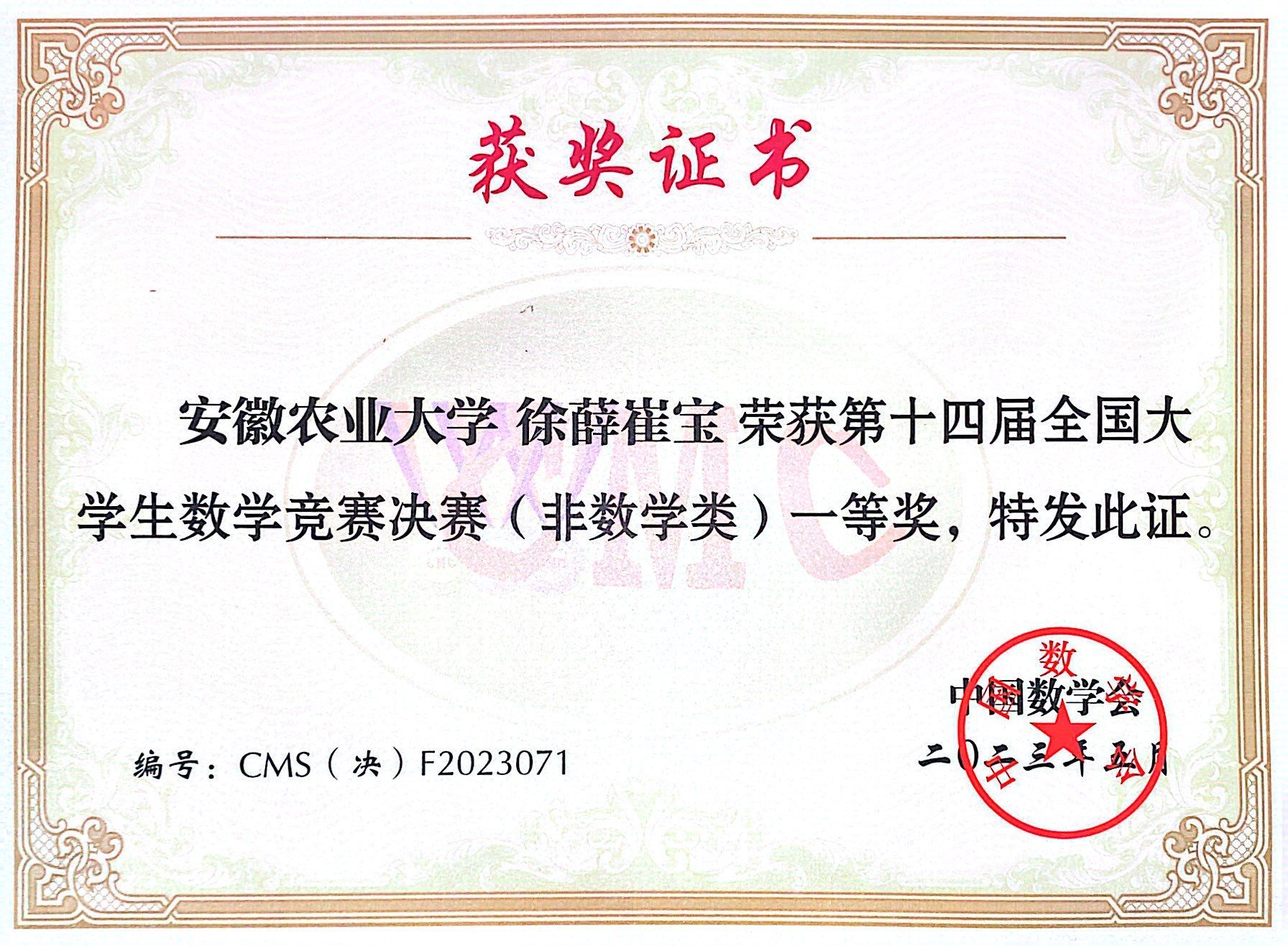 本网讯 由中国数学会主办的第十四届全国大学生数学竞赛决赛5月26日至28日在广东工业大学举行,理学院教师汪宏喜和周丽指导的2020级数据科学与大数据技术专业学子徐薛崔宝表现突出,斩获非数学类一等奖佳绩,是安徽省唯一一个全国非数学类一等奖。