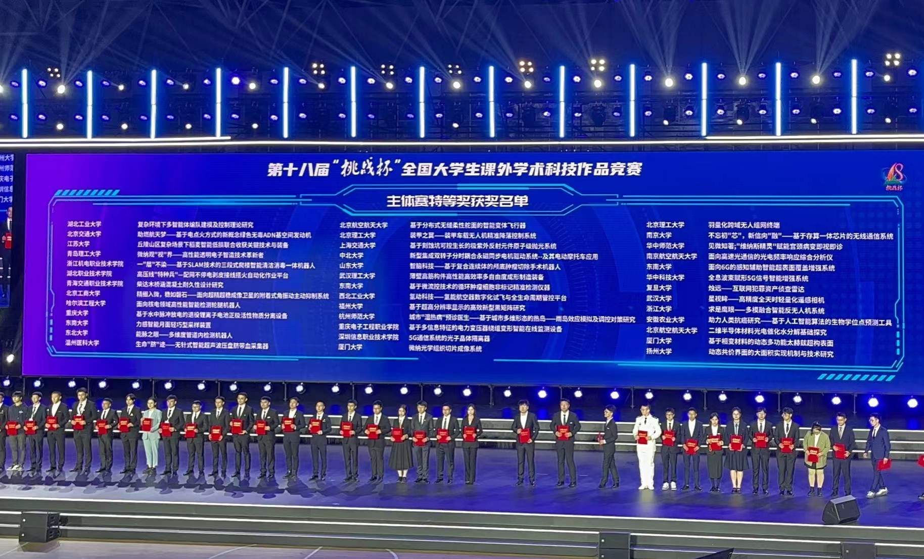 本网讯 10月30日,由共青团中央、中国科协、教育部、中国社会科学院、全国学联、贵州省政府共同主办的第十八届“挑战杯”全国大学生课外学术科技作品竞赛在贵州大学闭幕。我校在主体赛中荣获全国特等奖1项、二等奖1项、三等奖4项;在红色专项活动中,荣获全国一等奖1项(安徽省唯一)、二等奖1项、三等奖1项;在“黑科技”展示活动中,荣获“星系级”(特等奖)作品1件、“行星级”(二等奖)作品2件、“卫星级”(三等奖)作品1件;在揭榜挂帅专项赛中,荣获全国三等奖2项。