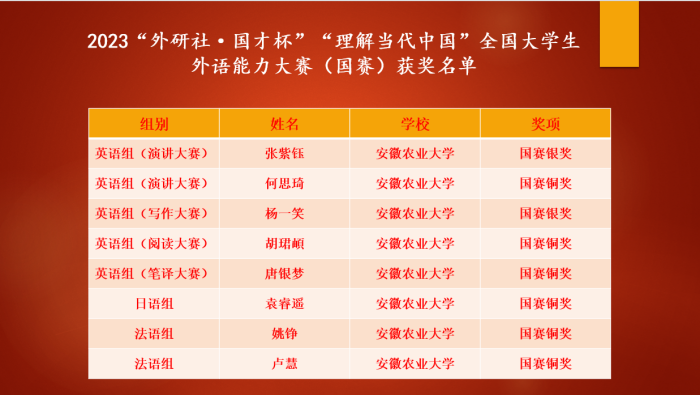 本网讯 近日,2023“外研社·国才杯”“理解当代中国”全国大学生外语能力大赛国赛圆满落幕。我校学子在英语组、日语组、法语组比赛中共获得2银、6铜的优异成绩。