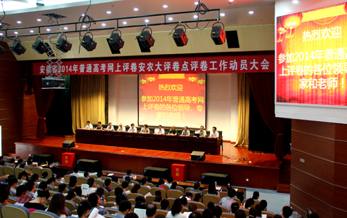 6月11日上午,安徽省2014年普通高考外语科目网上评卷动员大会在我校新图书馆学术报告厅召开,这是安徽省普通高考实行网上评卷以来,我校连续第9年承担此项任务。校网评领导组组长、校党委副书记王华丽,校网评领导组副组长、党委常委、纪委书记裴树东,省教育招生考试院副院长邸建伟出席会议。网评工作领导组成员、网评办公室工作人员及全体评卷教师500余人参加会议。